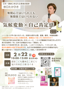 2026年2月22日(1件のイベント) おらが街のイベント情報 谷口たかひささん お話し会in旭川 谷口たかひささんは、世界100か国を旅しながら、国内外の小学校から国会・国連まで講演されている「日本一講演によばれる環境活動家」です。 ●谷口たかひささんインスタグラム |