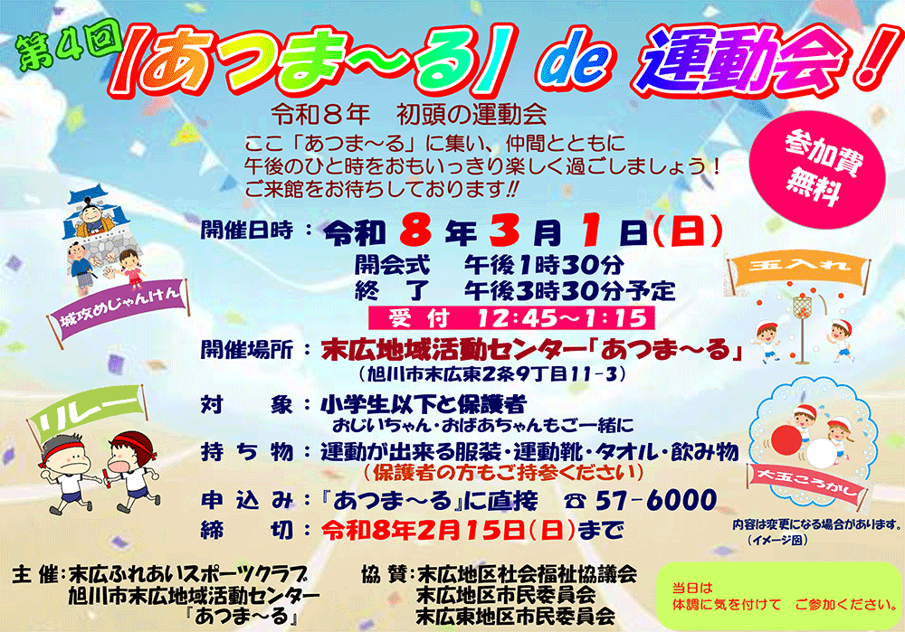 2026年3月1日(1件のイベント) おらが街のイベント情報 【注意】※2月8日から「3月1日に延期」になりました。申込締切は2月15日です 第4回「あつま~る」de運動会! ■主催/末広ふれあいスポーツクラブ、旭川市末広地域活動センター「あつま~る」 |