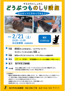 ■日時/2月21日(土)10:20~11:00 ■内容/飼育員さんのおはなし(ヒグマについて)、モルモットとのふれあい体験など ■申込/2月7日(土)10:00~図書館カウンターまたは電話(0166-54-7111)にて申込ください |