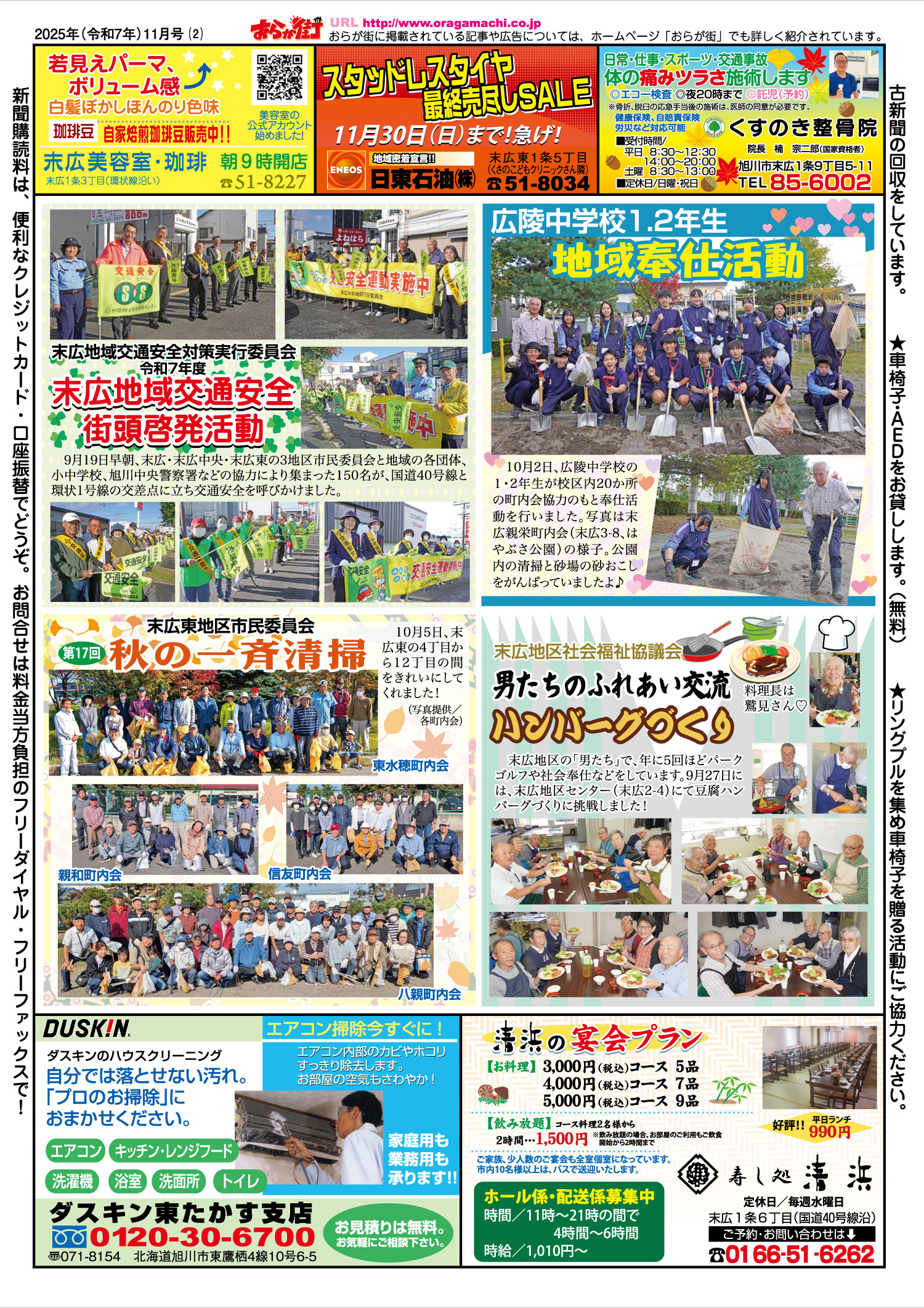 ■2面… 末広地域交通安全街頭啓発活動(末広地域交通安全対策実行委員会)/ 地域奉仕活動(広陵中学校1.2年生) / 第17回秋の一斉清掃(末広東地区市民委員会) / 男たちのふれあい交流 ハンバーグづくり(末広地区社会福祉協議会)