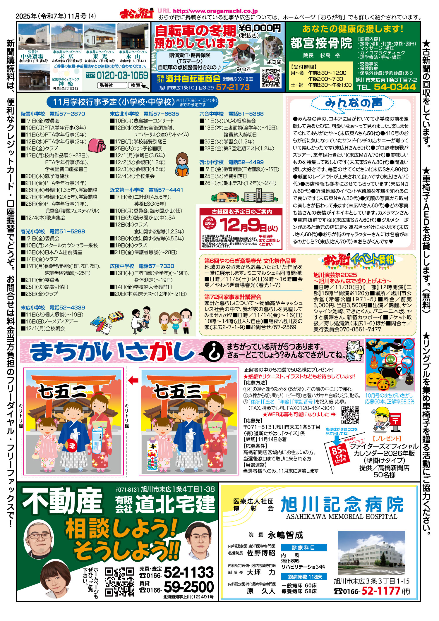 ■4面… 小学校・中学校学校行事予定 / 古紙回収日のご案内 / みんなの声 / おらが街イベント情報 / まちがいさがし(WEB応募はこちら)