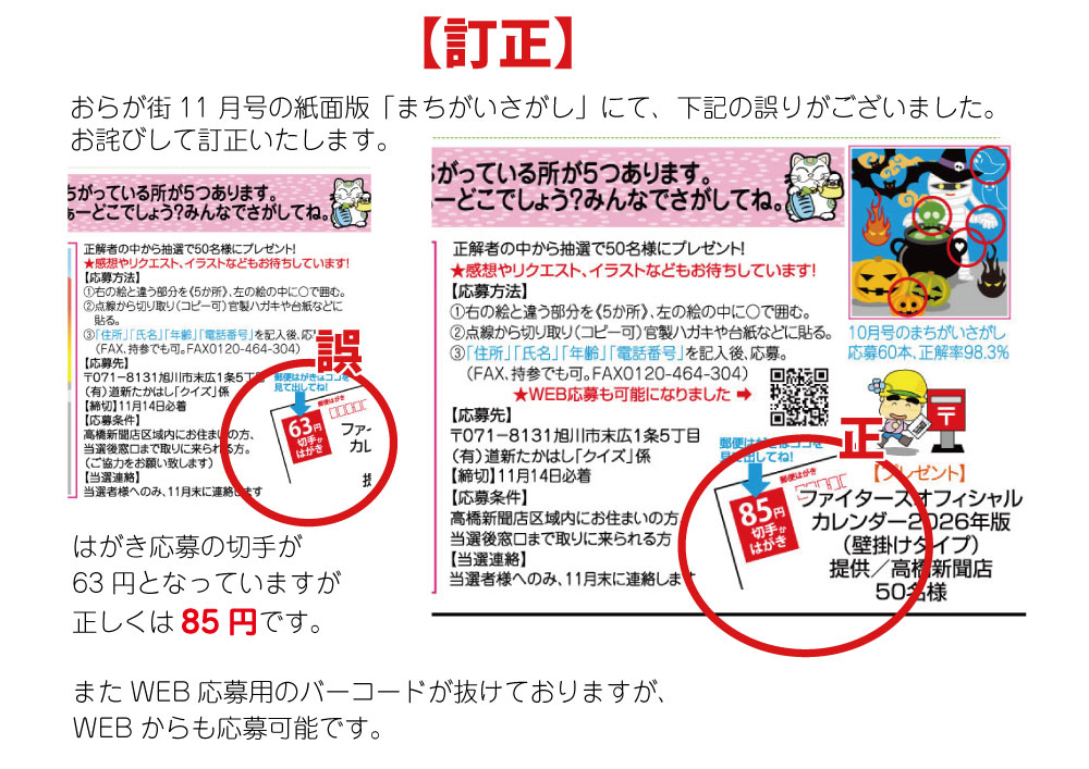 ※おらが街11月号(紙面版)「まちがいさがし」にて下記の誤りがございました。お詫びして訂正いたします。(WEB版は訂正済みです)